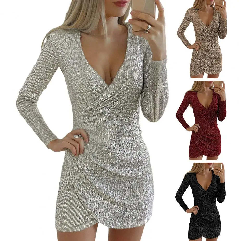 Printemps automne femmes robe paillettes col en V profond coupe ajustée manches longues coupe ajustée irrégulière plissée fête Club robe courte rencontres bal Mini robe