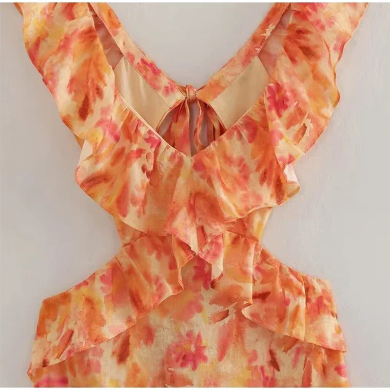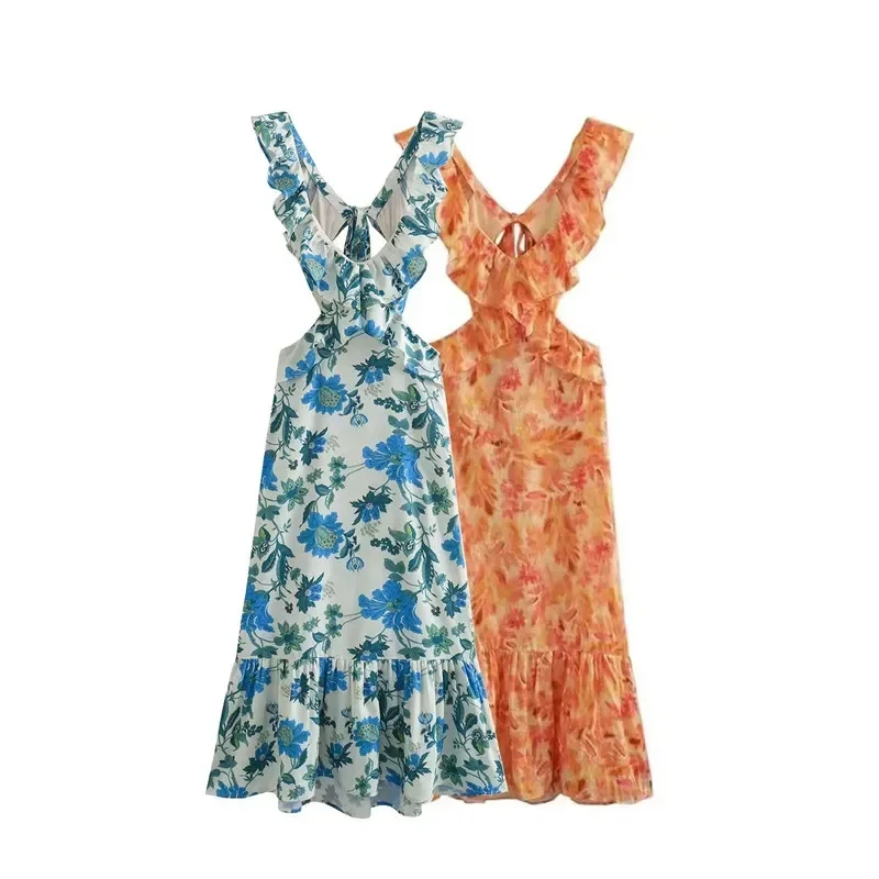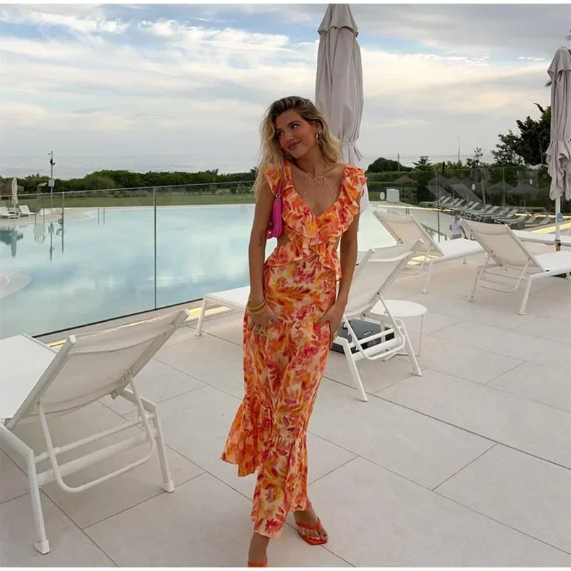 Robe longue imprimée dos nu pour femmes, Sexy, manches papillon, ajouré, Bandage, vacances d’été, à volants, Robe de plage, 2025